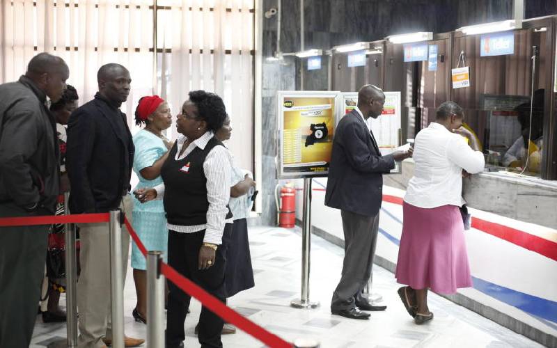 Clients queue in a banking hall to transact. [Wilberforce Okwiri, Standard]