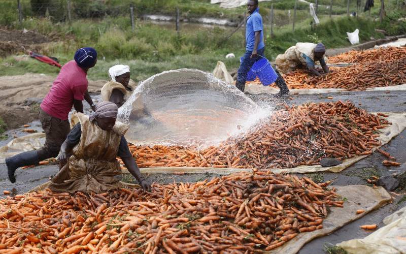 Farmers washing carrots before packaging at Mau Narok in Nakuru county on October 26, 2018.They decry to exploitation by middlemen who export the produce to Uganda.[Kipsang Joseph/Standard]