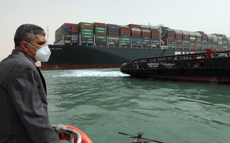 Lt. Gen. Ossama Rabei, head of the Suez Canal Authority, investigates the problem with the Ever Given, a ship that wedged across the canal in 2021. [AP photo]