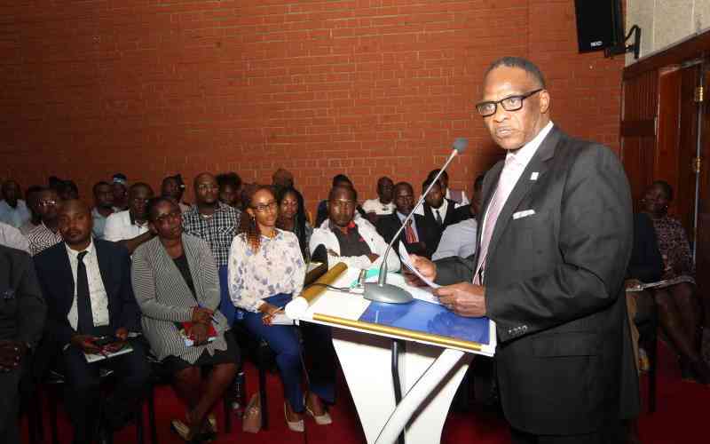 Deputy Vice-Chancellor Academic and Student Affairs KCA University Prof Joshua Bagaka's address during a discussion on Taxation and Bottom Up Economic model at KCA University on Feb 23, 2023. [Jonah Onyango, Standard]