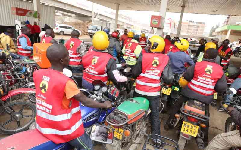 Boda Boda operators line-up at a Petrol station for free fuel. [Pius Cheruyoit, Standard]
