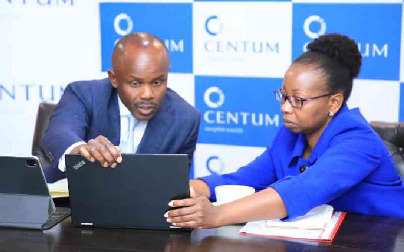 Centum Group CEO James Mworia and Centum Group CFO Risper Alaro during the Centum Investment Half Year Results announcement. [Wilberforce Okwiri, Standard]