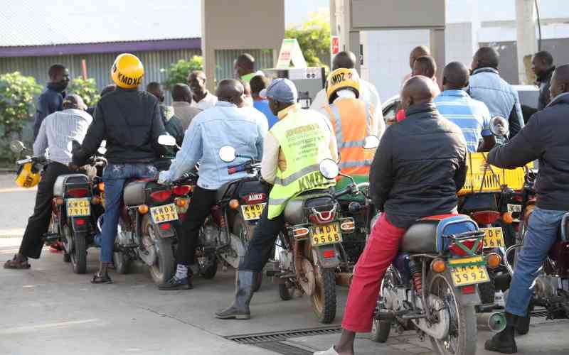 Bodaboda riders queue to fill their tanks with fuel at a petrol station during a previous fuel shortage across the country. [File, Standard]