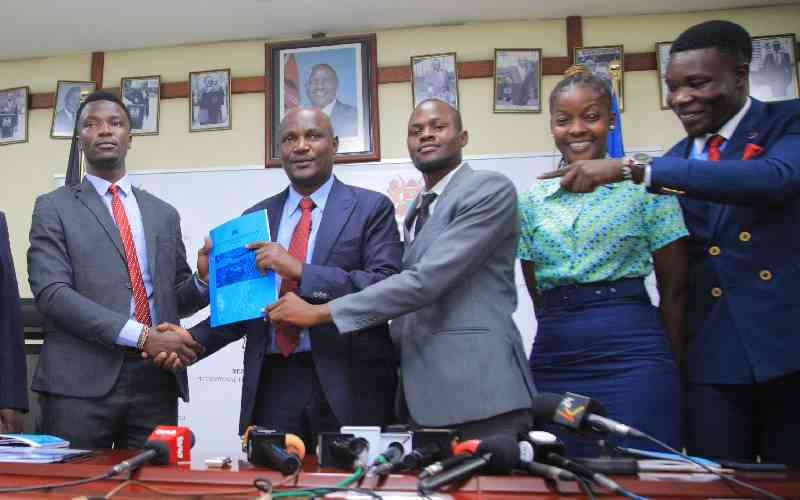 Treasury CS John Mbadi (second left) receives National Student Budget Forum FY 2026/27 from the National Students Budget Chairman Solomon Oketch at the Treasury Building, Nairobi, on December 18, 2025. [Elvis Ogina, Standard]