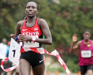 Diamond Run Commonwealth Winner of 10, 000M race Florence Kiplagat cross the line to win Women Category of the 1st Edition of County Pension Fund, CPF, Nairobi Diamond 10KM Run after clocking 31:42.0 at Uhuru Park on Sunday, August 17th, 2014. Photo/Jonah Onyango.