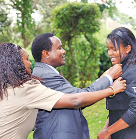 Vice-President Kalonzo Musyoka and his wife Pauline pin a badge on Dorcas Maria Jacob, one of eight lucky students proceeding to Cyprus on a scholarsh