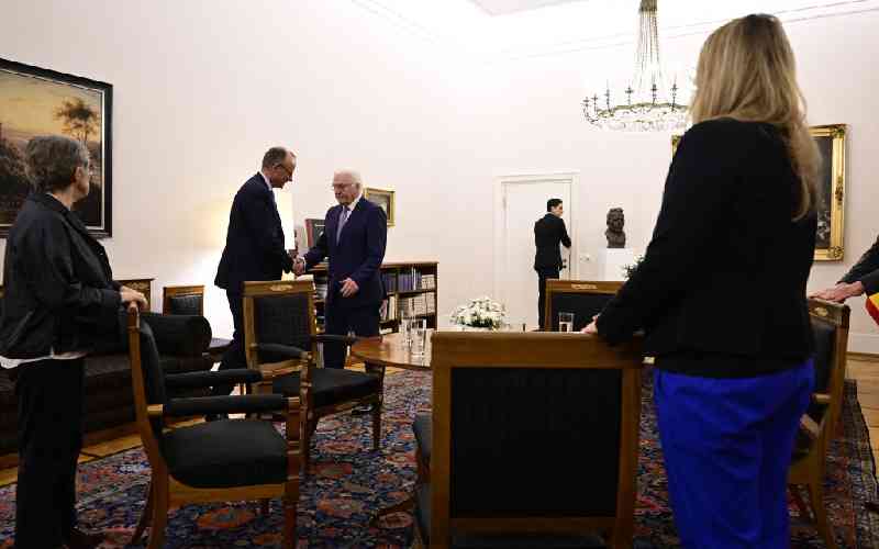 German President Frank-Walter Steinmeier (3rdL) shakes hands with Leader of Germany's Christian Democratic Union (CDU) Friedrich Merz (2ndL) as he arrives for a meeting with Parliamentary group co-leaders in Berlin, on November 12, 2024. [AFP]