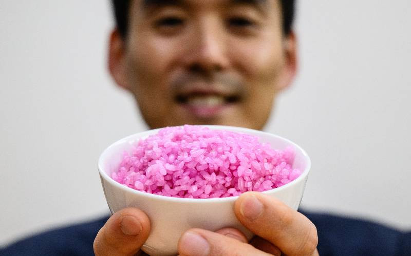 This picture taken on May 21, 2024 shows professor Hong Jin-kee posing with a bowl containing pink "meaty rice" at the Yonsei University in Seoul. In a small laboratory in Seoul, a team of South Korean scientists are injecting cultured beef cells into individual grains of rice, in a process they hope could revolutionise how the world eats. [AFP]