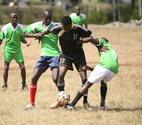 | Nairobi Aviation College's Sanlazz Dino, center, dribble ball past Anthony Kanyi, right, and Shadrack Makau of NYS Nairobi Holding Unit during their Universities and Colleges Football League at NYS Grounds Nairobi on Saturday, October 18th, 2014. Photo/Jonah Onyango. |