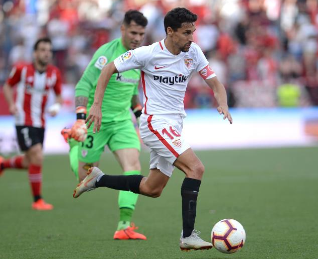 Sevilla's Spanish midfielder Jesus Navas (R) vies for the ball with Athletic Bilbao's Spanish goalkeeper Iago Herrerin (L) during the Spanish League football match between Sevilla and Athetlic Bilbao at the Ramon Sanchez-Pizjuan stadium in Sevilla on May 18, 2019. (courtesy)