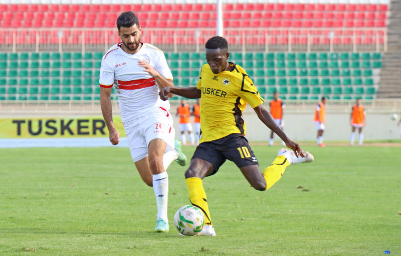 Tusker midfielder Boniface Muchiri (R) in action during their CAF Champions League first leg match against Zamalek at Nyayo Stadium on October 16 2021. [Tusker FC]