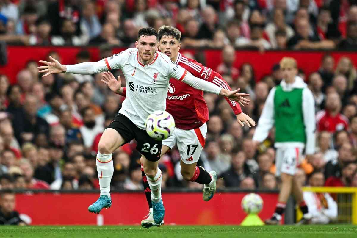 Liverpool's Scottish defender Andrew Robertson (L) vies with Manchester United's Argentinian midfielder Alejandro Garnacho. [AFP]