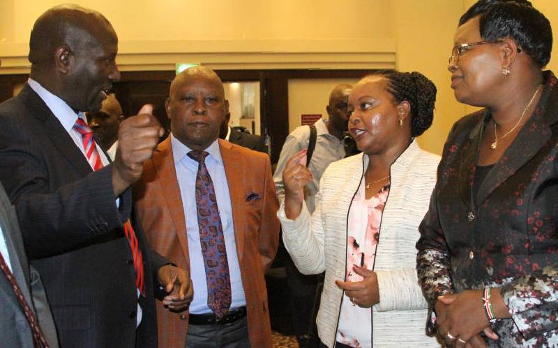 Kirinyaga Governor Anne Waiguru (second left) Mutahi Kahiga (second right) and Maragwa MP Mary Wamaua (right) with Kenya National Highways Authority Director General Peter Mundinia in Nairobi. [David Njaaga,Standard]