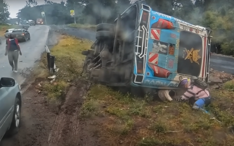 A minibus carrying an unknown number of passengers overturned on Magadi Road, leaving those inside trapped as they struggled to free themselves.