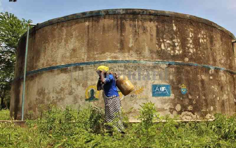 A woman draws water at a tank which is part of the Masue Rock Water Catchment project in Makueni County on April 13, 2023. [Philip Muasya, Standard]