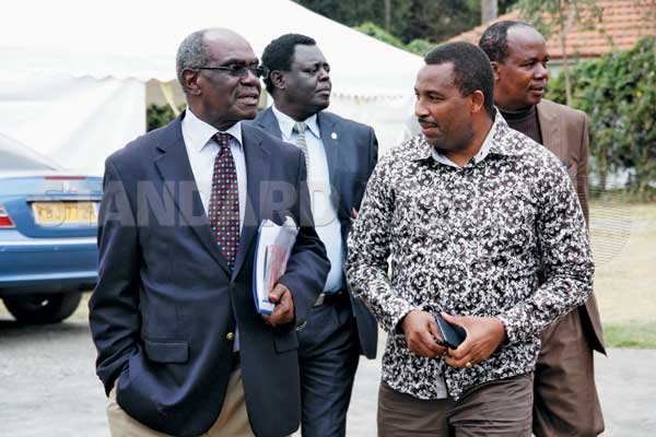 | Wiper Chairman David Musila and Justus Wabutura after the party’s meeting in Nairobi, yesterday. [PHOTO: Jenipher wachie/ STANDARD] |