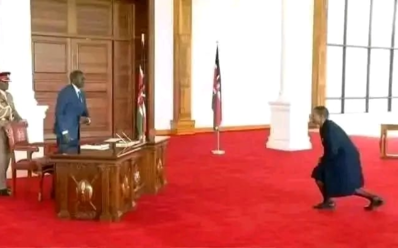 A photo of Attorney General Dorcas Oduor appearing to kneel before President William Ruto has gone viral, igniting heated conversations across social media platforms.
