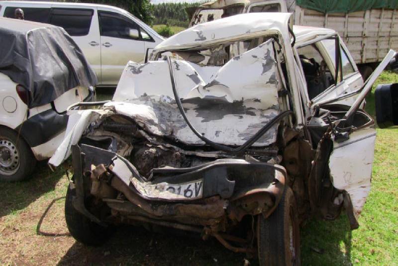 The wreckage of the ill-fated salon vehicle in which six people believed to be from one family perished in after it was involved in a head-on collusion with a trailer at complex area along the Kericho- Nakuru Highway. [Photo: Standard]