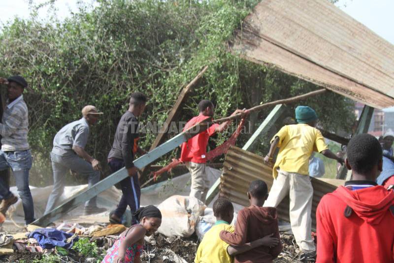Irate locals demolish temporary kiosks at Bodneni slum estate in Nakuru suspected to be hiding place of criminal gangs after a 35 year old woman was found killed and abandoned in one of the kiosks. AUGUST 11, 2018. [PHOTO: MERCY KAHENDA/STANDARD]