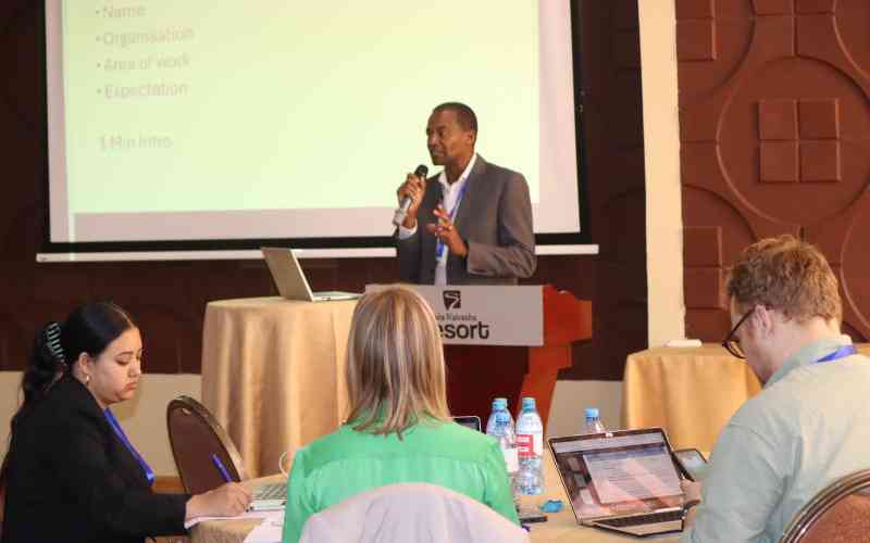 Bernard Kimoro, Head of Climate Change and Livestock Sustainability, State Department of Livestock Development addresses participants during a regional workshop organised by FAO and African Centre for Technology Studies in Naivasha. [Courtesy]