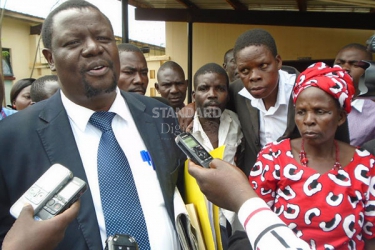 Mr Andrew Kituyi, the lawyer representing Saleh Wanjala famously known as ‘Bungoma’s James Bond’ in white shirt and his mother Everlyne Namusia (Right) address the press at Bungoma law courts shortly after he was released on a Sh30,000 cash bail [PHOTO: TITUS OTEBA/STANDARD]