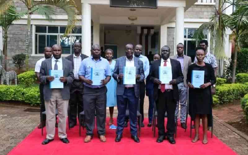 Vihiga governor Wilber Ottichilo (front row, centre), on April 26, 2023 at the county headquarters in Mbala, after receiving a report of the taskforce that investigated Amatsi Water Services Company. [Brian Kisanji, Standard]