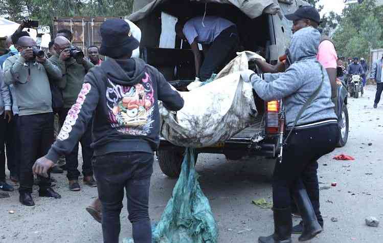 Police load one of the sacks containing a body of unidentified person into a vehicle on July 14, 2024 after recovery. [Denish Ochieng, Standard]