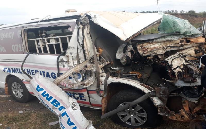Wreckage of an ambulance that collided with a car on Kenol-Murang’a Road near Maragua River Bridge in Muranga County. [Boniface Gikandi, Standard]