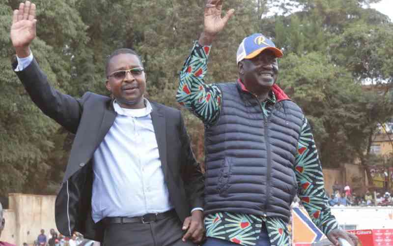 When Mwangi wa Iria accompanied Azimio la Umoja One Kenya Presidential candidate Raila Odinga at Mumbi Ground in Murang'a County. [Kibata Kihu, Standard]