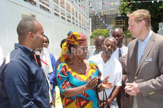 Mombasa Governor Ali Hassan Joho (left) welcomes Ugandan High Commissioner to Kenya Angelina Wapakhabulo (centre) and Damen Shipyard’s Director of Civil and Modular Construction Marcel Karsijns during the pre-launch of the Ugandan ferry named Albert Nile-1 at the Mombasa Ferry in Mombasa County on Wednesday. The ferry has been built in Kenya. [Photo: Kelvin Karani/Standard]