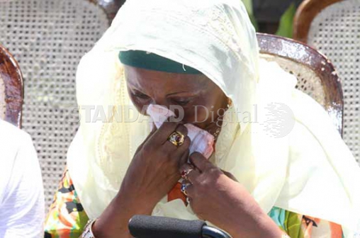 Kwale County Women Representative Zeinab Chidzuga sheds tears at a press conference called by Women Leaders at Oceean View Hotel in malindi, Kilifi County on Tuesday,08th March,2016. The Women were protesting against a Malindi Woman Tailor Martha Mwanguo Mele who was allegedly undressed by Youths outside karima Polling Station, Shella ward in Kilifi County during the Malindi by-elections. Mele , a Mother of Two who was suspected over voter bribery claims said she had gone to vote and blamned Police for failing to protest her. PHOTO BY MAARUFU MOHAMED/STANDARD