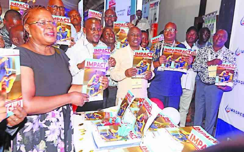 Water, Sanitation and Irrigation Cabinet Secretary Alice Wahome (left) when she joined guests during the launch of a Water Impact Plan during Kenya Water and Sanitation International Conference and Exhibition at Whitesands Beach Hotel in Mombasa on June 19, 2021. [Omondi Onyango, Standard]