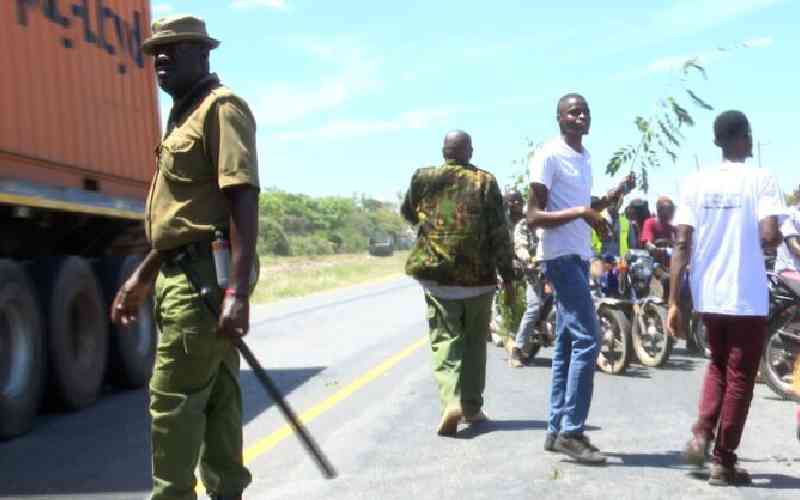 Police officers patrol the Mackinnon Road area that is at the centre of a boundary dispute between Taita Taveta and Kwale counties. [Courtesy]