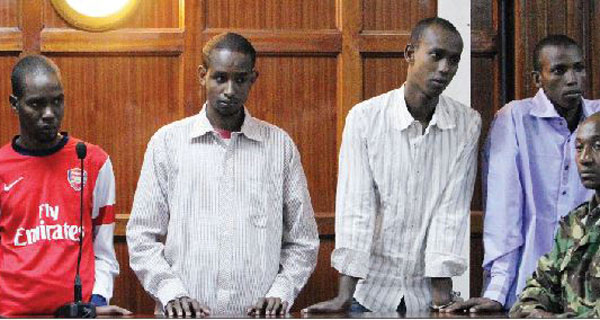 | Westgate terror suspects Hussein Hassan Mustafah, Adan Mohamed Ibrahim alias Adan Abdikadir, Mohamed Ahmed Abdi and Liban Abdullah Omar at Nairobi’s Milimani Law Courts, Wednesday. [PHOTO: GEORGE MULALA/STANDARD] |