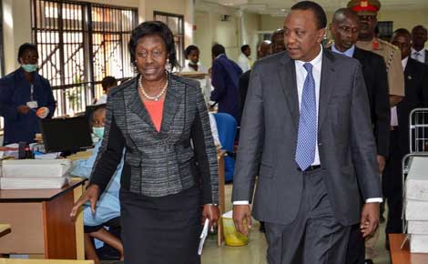 | President Uhuru Kenyatta with Lands Cabinet secretary Charity Ngilu at Ardhi house. He made a surprise visit on Thursday, a gesture interpreted as supporting Ngilu in her reforms. (Photo:PSCU) |