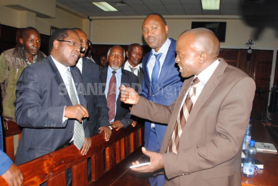 Embu Governor Martin Wambora at Milimani court with his lawyer Wilfred Nyamu (centre) and Ndegwa Njiru for the 33 petitioners (Embu residents) Wambora was seeking to stop a 2nd move to impeach him by members of county’s assembly. [PHOTO: GEORGE NJUNGE/STANDARD]
