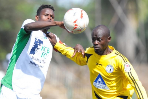 KCB Bethuel Warambo(L) and Ezekiel Odera of Sofapaka eye for ball possession during their KPL match at City Stadium on Saturday 11/07/15.PHOTO.BONIFACE OKENDOCaption