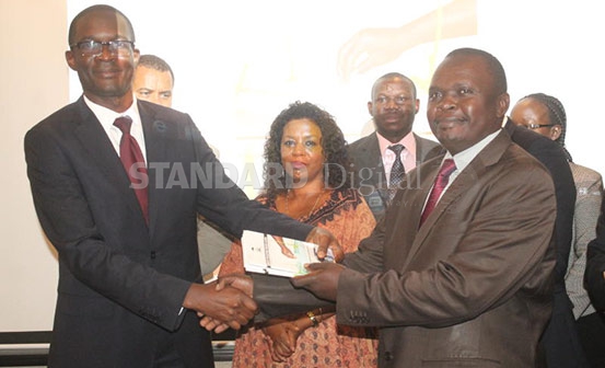 The independent Electoral and Boundaries Commission (IEBC) Chief Executive Officer Ezra Chiloba (left) and former Law Society of Kenya ChairmanJames Mwamu in Kisumu during the release of a 44 page report on the 2013 General Elections by Law Society of Kenya (LSK) in Kisumu. PIC BY COLLINS ODUOR