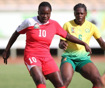 Harambee Starlet's Carolyne Anyango (left) and Brigitte Omboudou of Indomitable Lioness of Cameroon during International friendly match at Kasarani in preparation for the African Women's Cup of Nations, Oct 22, 2016. [PHOTO: JONAH ONYANGO/STANDARD]