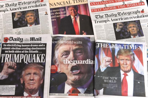 A selection of the front pages of the British national newspapers showing the reaction following Donald Trump's shock US presidential victory in London on November 10, 2016. A triumphant Donald Trump heads to the White House Thursday for talks with President Barack Obama on securing a smooth transition of power and steading nerves after an election that shocked the world. / AFP PHOTO /
