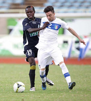 Gor Mahia under19 Amos Nondi takes on Italy's Dario Spadaro during their friendly match at Kasarani on 18-04-2014.DENNIS OKEYO