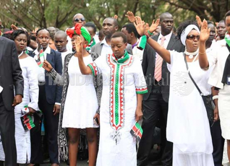 Deputy President William Ruto's wife Rachael (centre) prays at Uhuru Park during prayers for the nation organised by Tuombee Kenya in Nairobi yesterday. [Beverlyne Musili, Standard]