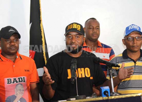 Mombasa Governor Hassan Joho, flanked by from right his running mate Dr.William Kingi, ODM parliamentary candidate for Nyali Said Abdalla ( Saido) and Jomvu Mo Twalib Badi addresses the medi at his Mombasa offices on Saturday,029th July,2017. [Maarufu Mohamed,Standard]