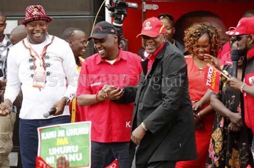President Uhuru Kenyatta (second right) and Baringo Senator Gideon Moi with other leaders during a Jubilee campaign rally in Kabarnet Town, Baringo County. [Kipsang Joseph/Standard]
