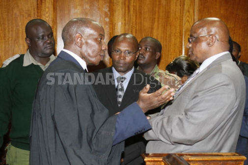 Convicts Wilson Thirimbu Mwangi(C) and Francis Karoki Muruatetu Thirimbu(R) consult with their lawyer Fred Ngatia after they were ordered by Supreme Court that their death sentence to go back to the High Court for a fresh sentence during the judgement at the Supreme Court on Thursday 14/12/17 [Boniface Okendo, Standard]