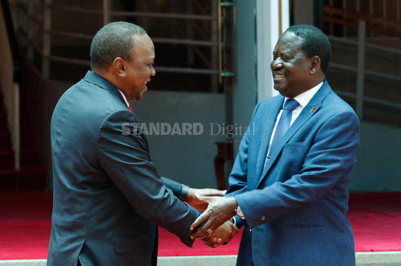 President Uhuru Kenyatta with former Prime Minister Raila Odinga when they agreed to unite and work together. [Photo/Standard]