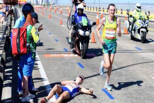 Michael Shelley passes Callum Hawkins (in white) who collapsed two miles away from the finish line. [Photo: Courtesy]