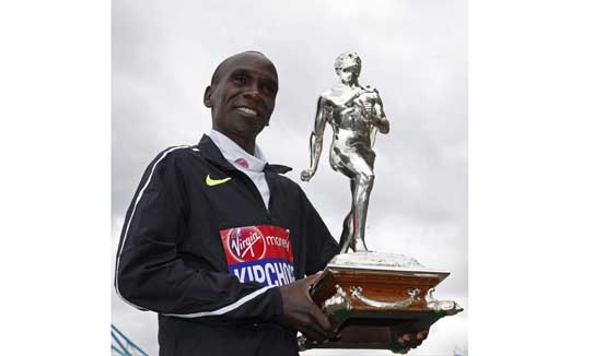 2016 Virgin Money London Marathon Winners Photocall - The Tower Hotel, St Katharine's Way, London - 25/4/16 Winner of the elite men's race, Kenya's Eliud Kipchoge poses with the trophy Action Images via Reuters