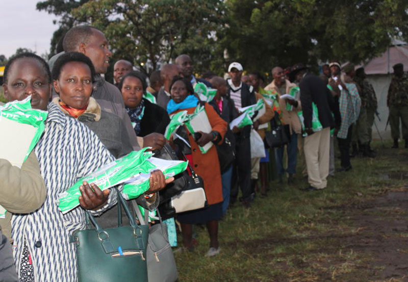 Exam center managers line up to collect exam materials at Bomet town depot Tuesday morning for day one of KCPE exams. [Gilbert Kimutai, Standard]