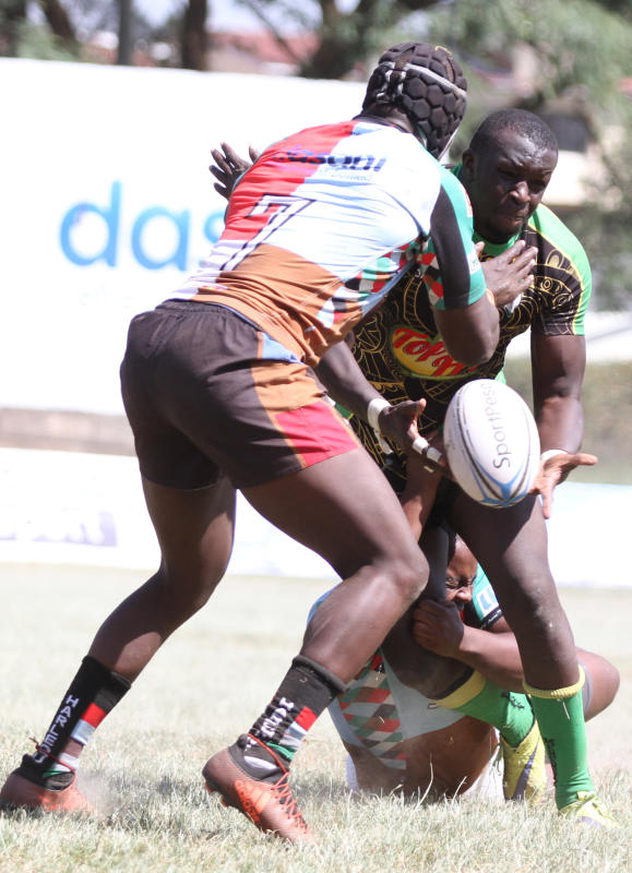 Kenya Harlequins' Patrice Agunda (left) and Philip Owuor of Top Fry Nakuru during a Kenya Cup match at RFUEA grounds on Saturday Jan 12, 2019. [Jonah Onyango, Standard]